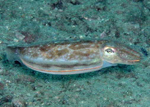 ボウズコウイカとそっくりですが、泳ぐときなど体に2本ラインが見えたら間違いなくスジコウイカです。ボウズコウイカは比較的穴の中で見れますが、この子は砂地や砂利の様な場所で見ることが多いです。