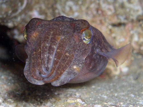 トンネル内や岩の穴の中で見ることが多いです。スジコウイカに比べると細身で足が長いです。