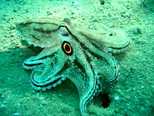 紫津浦に颯爽と現れました。初めはヨツメダコとも思いましたが、そちらは眼状斑に青みが帯びるらしく、こちらの方はオレンジ色が強いためイイダコとしました。眼が4つあるみたいでおもしろいです。