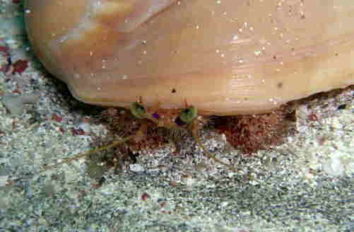 眼柄が紫色でとてもきれいなヤドカリですが,夜行性なのであまり見ることはできません。砂地を好むようで,いずれも沖の砂地で見れました。