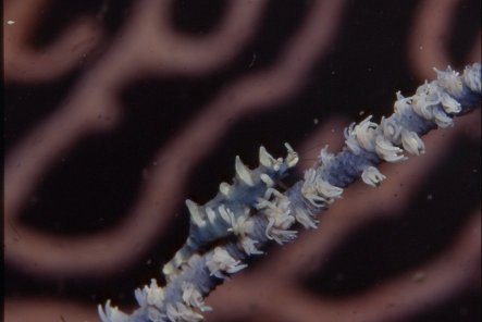 夏になるとトンネル出口のムチヤギにつきます。多い時には1本のムチヤギに5匹以上ついていたこともありました。宿主であるムチヤギにより体色を変えますが、青海島のビシャモンエビは真っ白で綺麗です。