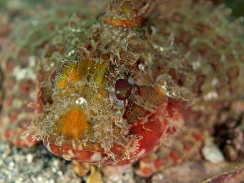 フサカサゴに比べると口が小さいためコクチなのかしら?。水中ライトで照らすときれいな赤色が浮かび上がってきます。