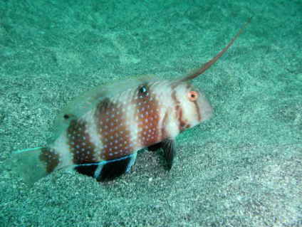 頭の上に細長いルアーがついていて,ひょうきんな形がおもしろい。ゆっくり近づかないとすぐ砂に潜ってしまう。