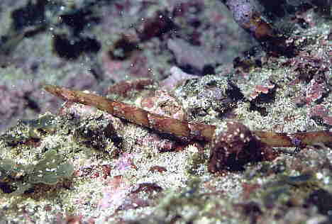 ヨウジウオやノコギリウオはほぼ1年を通して見ることができるが,イシヨウジとこのホソウミヤッコは青海島では夏〜秋にかけて目にする。岩場をなめるように見ていくと,特徴ある柄が海藻の間から見えてくるが,ヨウジウオの仲間では見つけにくいほうだ。