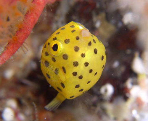 黄色のボディに水玉の黒点がついていて,サイコロのようなとっても小さな小さな「ミナミハコフグ」の幼魚。口をとんがらせるように泳ぐ姿がすごく愛らしい