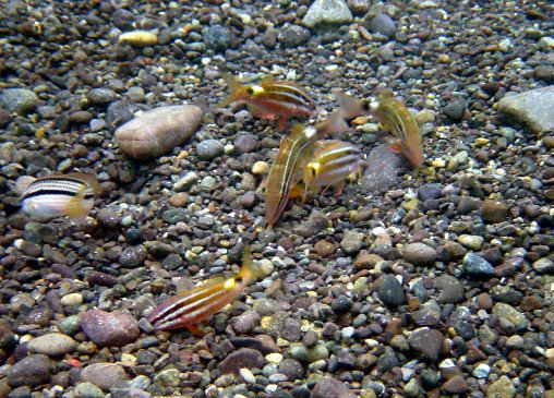 初夏ごろから数が増えてきますが、ちょっぴりおとぼけで、自分の群れではなくホンベラやキュウセンなどの群れに混ざり一緒に行動している姿をよく見かけます。