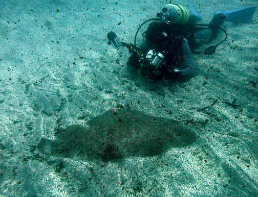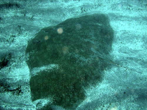 05/09/23青海島「船越」左の瀬コースの砂地で、見慣れない場所に岩があったので、近寄ってみると、なんと!!大きなツバクロエイだった!!またまた青海島初記録。