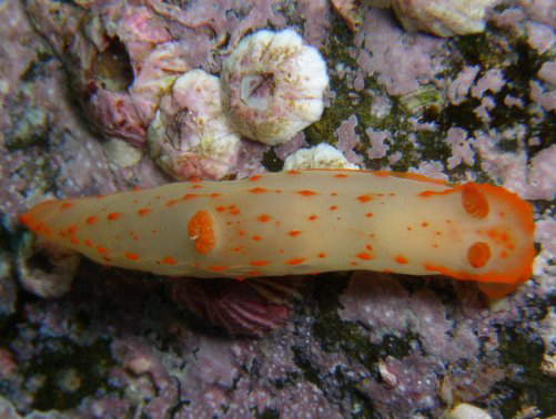 キヌハダウミウシ科の中で最も多く見ることができる種で,特に紫津浦で冬〜春にかけてよく見かけます。白く透き通ったボディにオレンジ色の点点がとても美しいウミウシです。