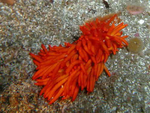 イボヤギを食し,イボヤギそっくりなこのウミウシは初冬の船越「トンネルコース」で見られました。日中はイボヤギ近くの岩のくぼみに隠れているようですが,船越ではトンネル内が薄暗いため堂々と出てきていました。ちょっと見ただけではウミウシに見えませんよね〜〜。