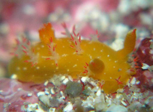 私達にとっては2005年初登場のウミウシでした。エダウミウシというウミウシもいますが、このウミウシはヒメが付くだけあってサイズも小さく突起につく赤色がかわいらしいです。