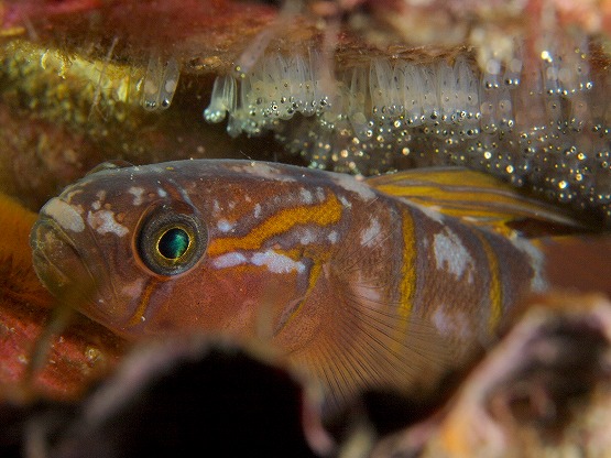船越では、久しぶりにコケギンポの求愛、産卵?を見ることが出来ました。以前と同じように、穴の中にいる個体にエラを見せるような行動をとった後、お尻を半分くらいまで突っ込んでプルプル震える動作を何度も見ることが出来ました。