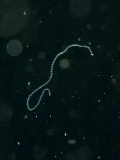 目をひいたのがゴカイ類の幼生と思われる生物です。赤い目がとっても目立つのですが、体は透明でしかもユラユラ泳いでるのでこちらも撮影は難しかったです。