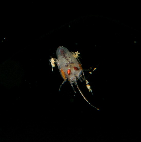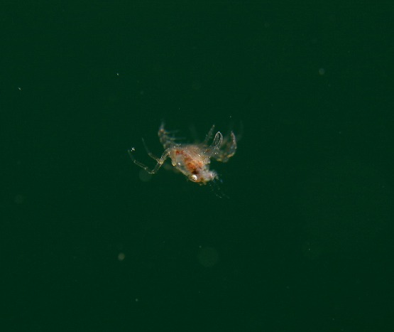 今日おもしろかったのは、おそらくヤドカリの仲間のメガロパ幼生だと思いますが、手?(足?)をしまって尾びれだけで泳ぎ、時折手足を出して静止するようなおもしろい行動を見ることができました。とっても小さいので撮影は難しいのですが、kenyuさんに撮影してもらいました。