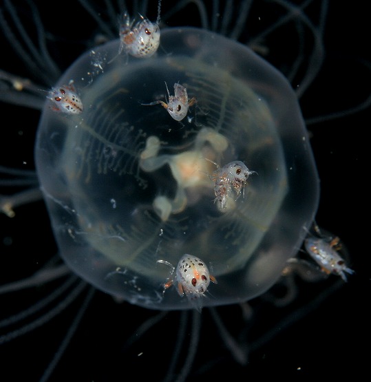 いろんなクラゲノミの仲間が見れるようになってまいりました。中には卵と思われるものを抱えてる個体もいて、こんなに小さいのにりっぱに繁殖行動してるんだなー。とちょっと感動!! |
