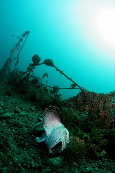 そしてクサウオのもとへ行くと、遠めに見て姿がありません。ひょっとしてと思い辺りを探すと海底に横たわってるクサウオが見えました。そうです。とうとう逝ってしまったのでした。