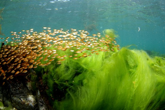 沖の砂地では今日も、サンゴタツが抱卵してたり、タツノイトコがペアになっていたりでこちらもとっても面白いです。浅場も相変らず癒し空間が広がっております。アイゴやニジギンポ、メバルなんかの幼魚も群れ始めてきました。夏ですねー。
