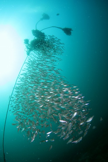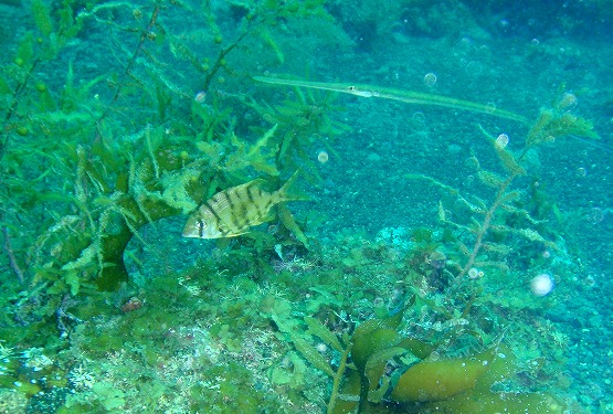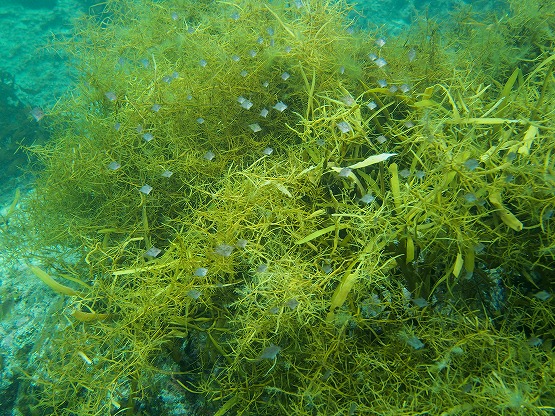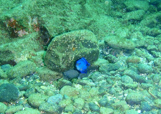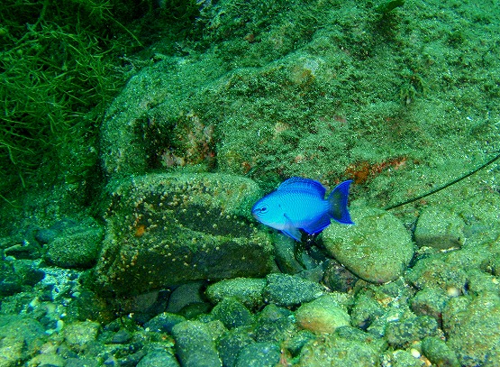 浅場ではアイゴの幼魚が群れており、ちょっと南国チックになってきました。ソラスズメダイの幼魚もかなり増えてきて、体験ダイビングはこのあたりが一番喜んでもらえるので、いい感じです。