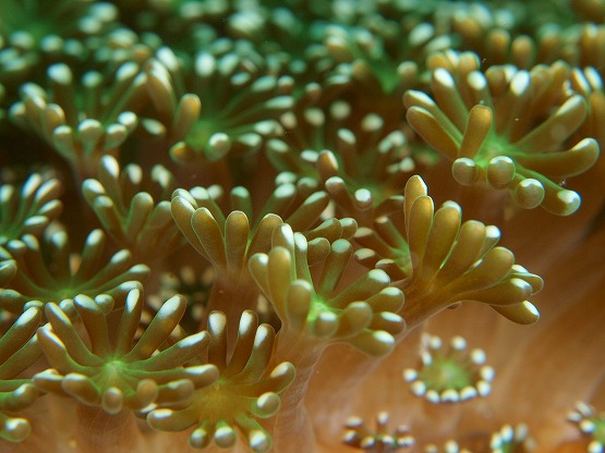 ニホンアワサンゴですが、毎年夏になるとどうも元気がなくなります。今日も若干ポリプが小さくなっていました。2年前は白化して、ほぼ全滅しちゃったので今年も水温がちょっと心配。今のとこ上がったり下がったりを繰り返してるのでたぶん今年は大丈夫さと思いますが、これからさらに水温が上がるとヤバイかもです。