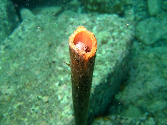 ほとんど皆さん久しぶりだったので1本目はリフレッシュっぽく潜ってきました。今日も抱卵中のサンゴタツや、ノコギリヨウジ、タツノイトコ、卵保護中のソラスズメダイ、ニジギンポなど見れました。ゴロタ付近に誰が立てたのか知りませんが、竹がポツンと立ててあって、その中にニジギンポが入っていました。僕はあんまり人工的にダイバーがこういった行為をするのは好きではありません。