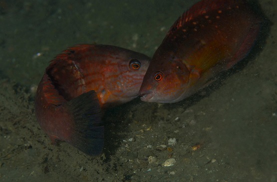 その他はビイドロカクレエビ、ミジンベニハゼ、マトウトラギス、アオハタなど見れました。船越では、ベニツケギンポ、イワアナコケギンポ、カザリイソギンチャクエビ、ヨウジウオなど見れました。ここにきて一気に水温が下がってきたので季節来遊生物が激減。タコベラはいるのはいるんですが、色が変わってちょっと寒そうにしていました。ソラスズメダイ達はまだまだ元気にたーくさん泳いでいました。今シーズンは越冬できるかな?