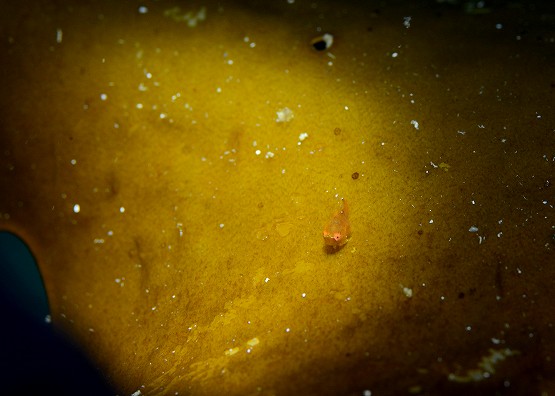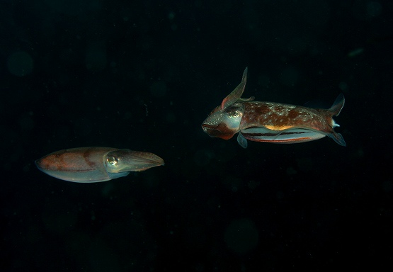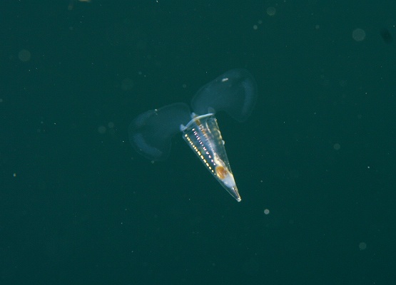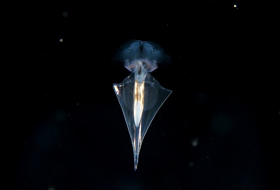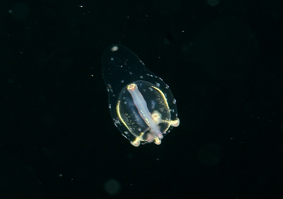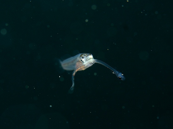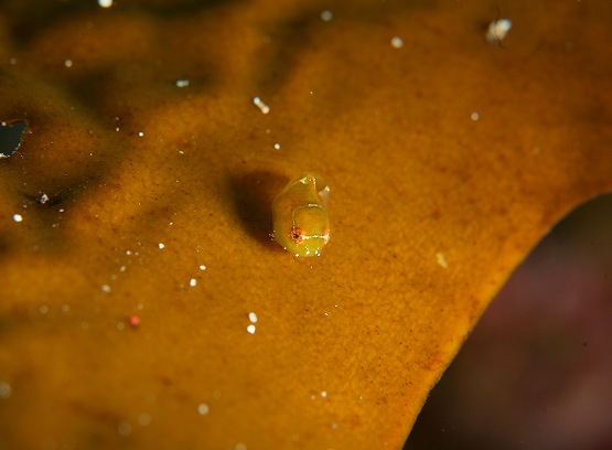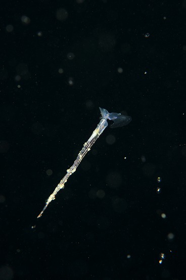 そして、最近ミサキコウイカやスジコウイカが群れている場所があるのですが、本日yuriさんが、スジコウイカの求愛シーンを撮影されていました。スジコウイカは上腕を上げ、鰭をヒラヒラさせながらメスの周りを回る行動が一般的です。動きが若干早いので、撮影は難しいんですが、激写されていました。浮遊系はというと、やはりちょっと不発気味でしたが、ようやくサルパの仲間が見れ出しました。