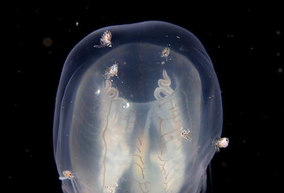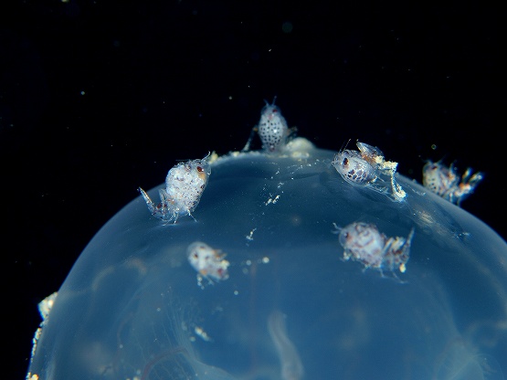 しかしまだ卵塊が何個か残っております。クラゲ類が今日も沢山見れたのですが、オワンクラゲが多くなってきて、沢山ウミノミの仲間が乗っかっています。