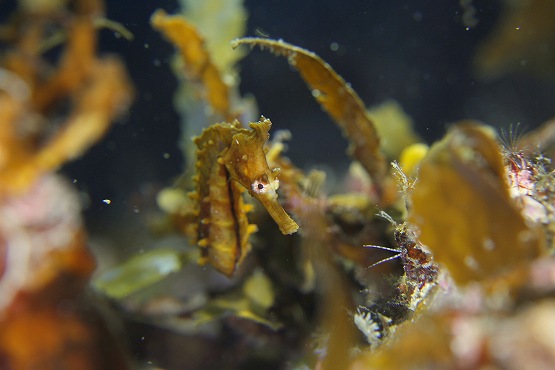 そして本日ヒットだったのがタツノオトシゴのペアです。どうやらオスが求愛しているようで、お腹を膨らませたり縮めたりして、自分のお腹の大きさをアピールしているような行動をとっていました。メスもお腹が大きくなっていて、ひょっとして産卵するかな?としばし観察しましたが、産卵には至りませんでした。