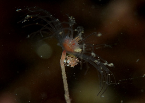 浮遊系は、久しぶりに、「やじろべえ」タイプのゾエア幼生を見ることができました。まだまだ小さな個体でしたがとってもかっこいい形でした。ただなかなか正面を向いてくれず、撮影は一苦労でした。その他微小クラゲ数種とウミノミの仲間、浮遊系のエビ類、縄張り争いしてるイトベラ、キイロウミコチョウなど見ることができました。