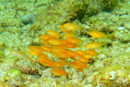 カンパチやヒラマサなんかも多くなってきました。浅場はアイゴの幼魚たちも群れはじめました。ネンブツダイの口内保育がかなりおすすめになってきました。オレンジ色の新しい卵や銀色のギラギラしたハッチアウトしそうな卵まで、群れてるのでとっても観察しやすいです。