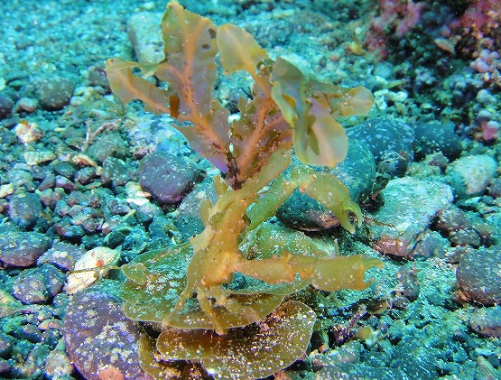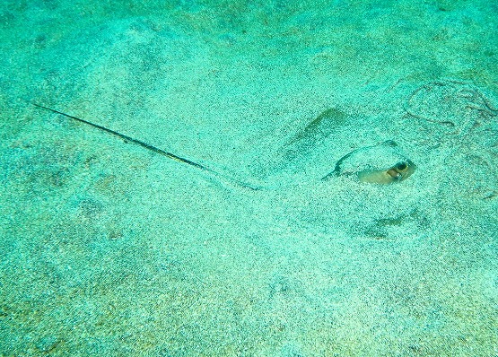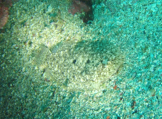 左の瀬では、砂地まで行くと若干水温が下がって気持ちいいです。透明度も良好で、魚の幼魚を狙ってミノカサゴ達がストーカーの様に追いかけてる姿をみかけます。