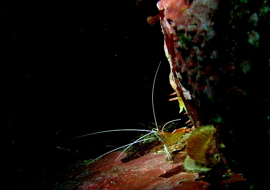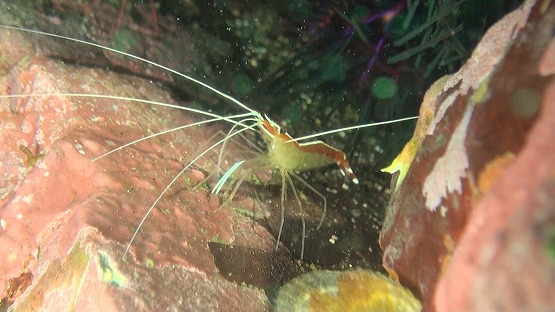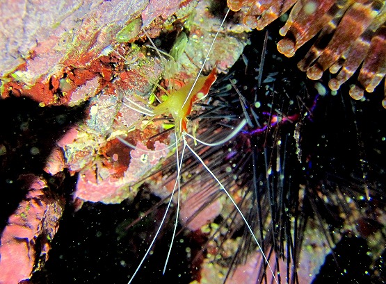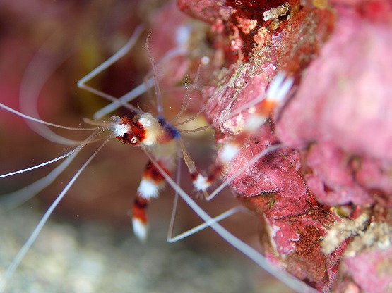2本目は洞窟コースへ。サクラダイは今日も健在!!しかもかなり慣れてきて、写真が撮りやすくなってきています。ふと近くの穴を見ると白いヒゲが見え隠れ。。。良く見るとオトヒメエビの子供でした。そしてよくよく見るとその横には、アカシマシラヒゲエビもいてちょっとラッキーでした。しばらく居ついてくれるといいですね〜。洞窟では、光がいっぱい差し込み、帰りにはのんびりとホンベラにクリーニングされるアイゴを見てEXしました。のんびりゆっくり気持ちの良いダイビングです!!