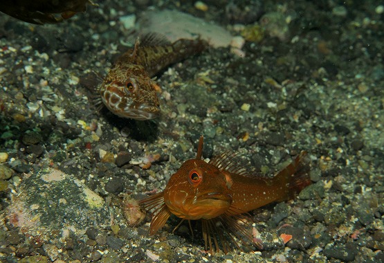 左の瀬へ行ってきました。今日のヒットはホシノハゼの求愛です。オスが尾びれをフリフリ振り、そのオスにメスがついていき、巣穴にまで入っていきました。婚姻色がとっても綺麗で、また見たいので明日も要チェックです。砂地では、マアジがけっこう群れてきてワイドが面白いです。