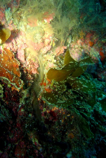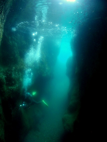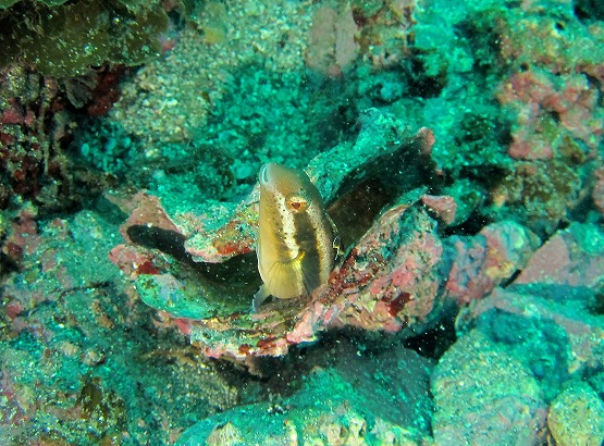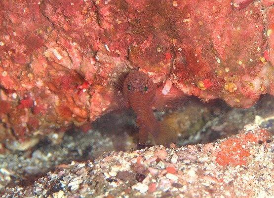 2本目は三角岩沖から洞窟へ行きました。ハナイカがそろそろ産卵してるだろうと思い、産みそうな場所をチェックしましたが、ハナイカすら見れませんでした。所々でミサキスジハゼが覗いてるんですが、臆病ですぐにひっこんでしまいます。洞窟は、透明度良好!!イソギンポは相変わらず卵を守っておりました。