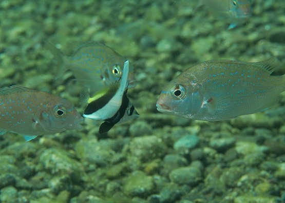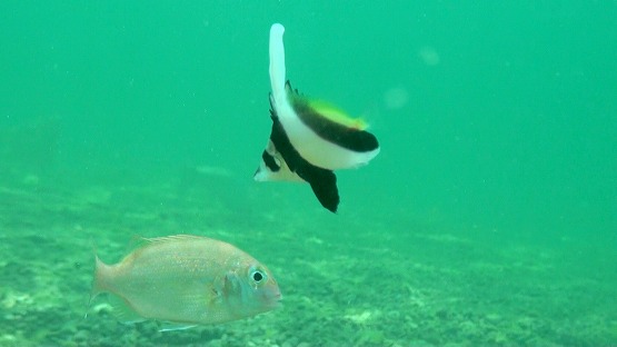 ENしてすぐにハタタテダイの幼魚を発見。その周辺にはマダイの幼魚も数匹。よくよく観察してみるとハタタテダイの幼魚がマダイの幼魚をクリーニングしていました。