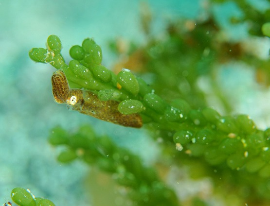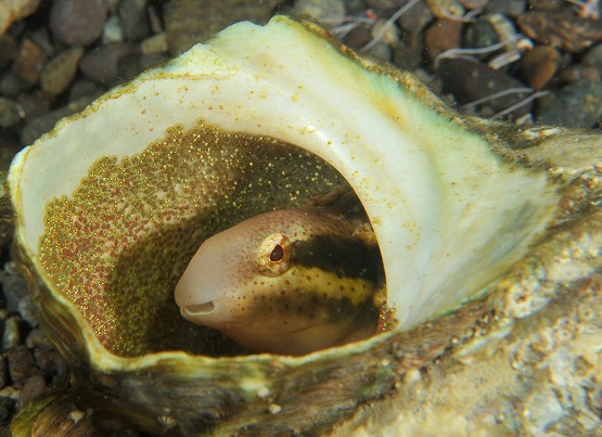 口をパカッと開けてなかなかの迫力です。ハナガサクラゲ、ヒメスイやタツノオトシゴのメス、ダンゴウオはまだ健在です♪砂地では、小さなタツノオトシゴ、そしてタツノイトコも登場していました。浅場にかえってくると、いつものサザエの殻の中に入ったニジギンポがお出迎え。かなり卵も成長してきています。