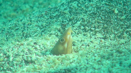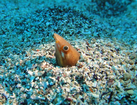 先日見たソラスズメダイの成魚ですがまだ産卵床を定めていない様子でした。ちょうどダイバーの通り道になっているところなので、いい場所を見つけてほしいですね〜。砂地ではマアジが群れ、ホオジロゴマウミヘビ、ホタテウミヘビ、ダイナンウミヘビと砂地から顔を覗けています。アカエイも颯爽と駆け抜けていきました。そしてクロエリギンポ達はすぐに砂に潜ってしまいました。