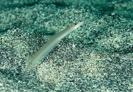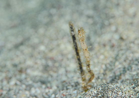 1本目は左の瀬へ。ネンブツダイの群れの中を見ると数匹口内保育中の個体が見られます。そして砂地がとっても面白いので、そこで時間をとって潜りました。皮弁が沢山ついたタツノオトシゴやサンゴタツ、タツノイトコ、大きなクロウシノシタ、久美さんがホオジロゴマウミヘビを教えてくれました。