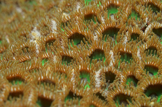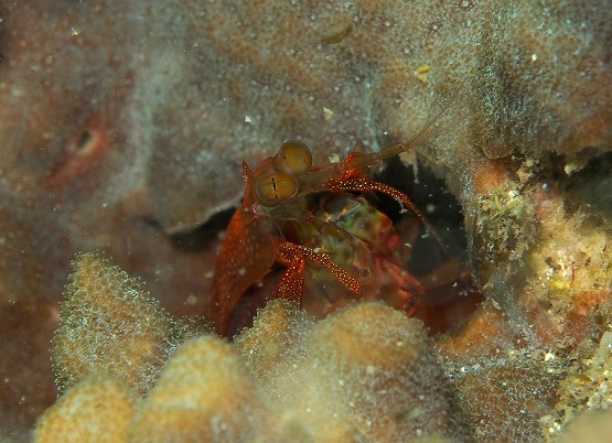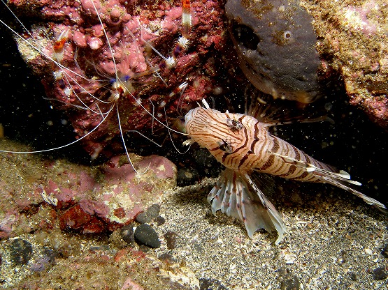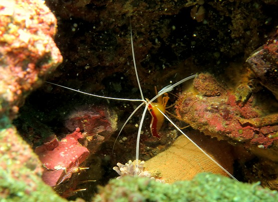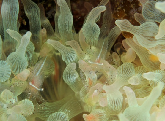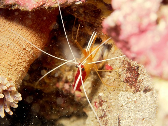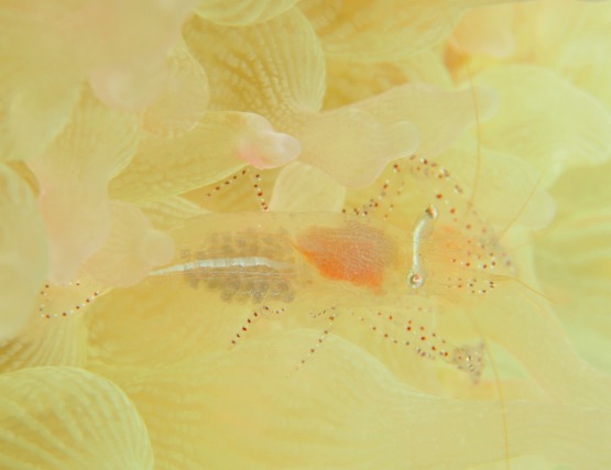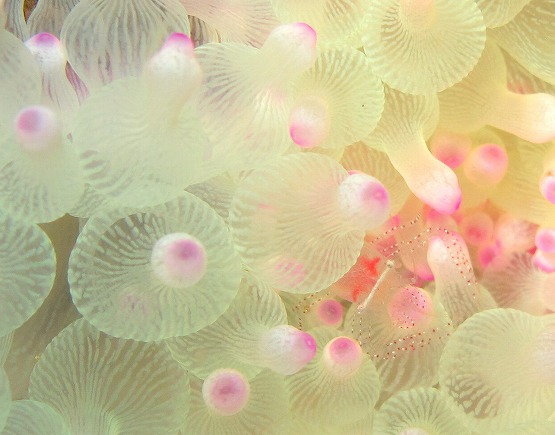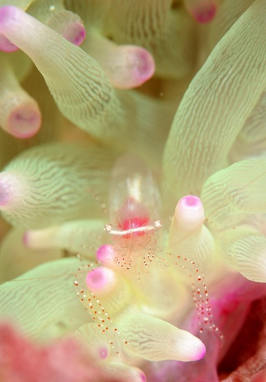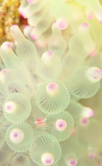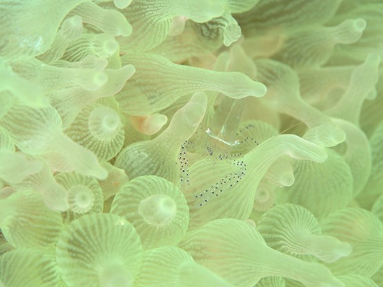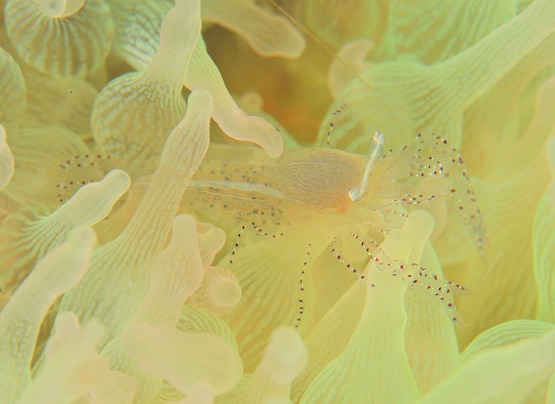 白化したイソギンチャクがとっても綺麗なんですが、普段は地味なカザリイソギンチャクエビも、周りの色に合わせているのか、ピンクっぽくなっててとても綺麗です。