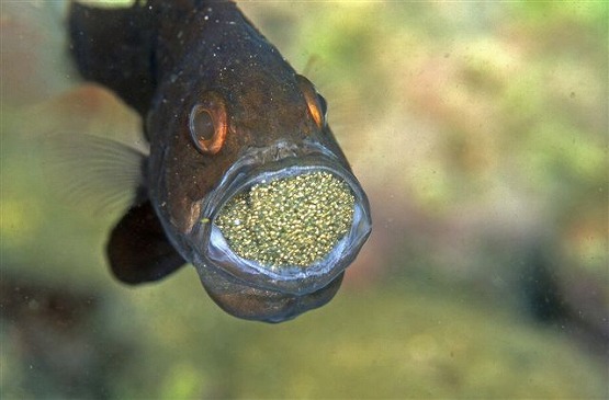 そしてこれは帰ってから気付いたのですが、ゆりさんに「一本目と二本目であきらかに口内保育しているクロイシモチの卵が減ってたよねー。」と指摘され、僕はぜんぜん気付かなかったのですが、画像を確認してみるとたしかに殻になってる卵が写っているではありませんか!!もうちょっと粘ってればハッチアウトが撮れたのかもしれませんね〜。それにしてもすごい観察力!脱帽です。