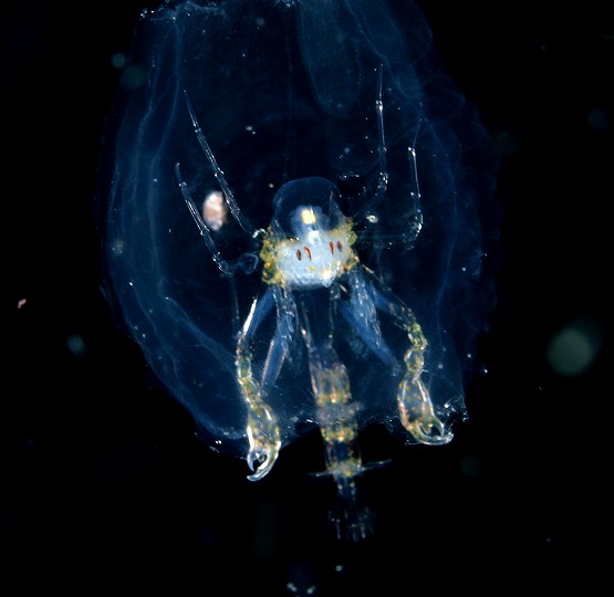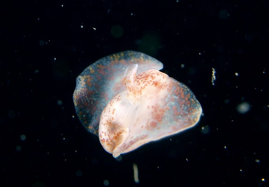 昨年目撃したウミコチョウの仲間もパタパタ飛んでいました。カメガイ系もかなり出ました。クリイロカメガイ、マサコカメガイ、ササノツユ、ウチワカンテンカメガイ、ウキビシガイ、ガラスウキヅノガイ、イクオハダカカメガイ、ヤサガタハダカカメガイなどすごかったです。ゾウクラゲの仲間も、ハダカゾウクラゲとヒメゾウクラゲが見れました。 そしてオオタルマワシは数えきれないくらい沢山見れました。特に卵を付けてる個体が多かったです。カレイやヒラメの仲間の幼魚も沢山!!チゴダラ科の一種と思われる魚の幼魚も数匹確認できました。キホウボウ科の一種と思われる幼魚もまたまた登場。とにかくすごかったです。オオトガリズキンウミノミは卵を持ってる個体が増えてきました。もうすぐ子育てするシーンも見れそうです。 浮遊の途中にも海底に行きハナイカもダンゴウオも見ることができました!さあこの浮遊系フィーバーはいつまで続くでしょう。 |