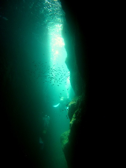 今日も雨が強く降っていましたが、水中はおだやかでした。1本目は左の瀬、2本目は洞窟コースへ行きました。